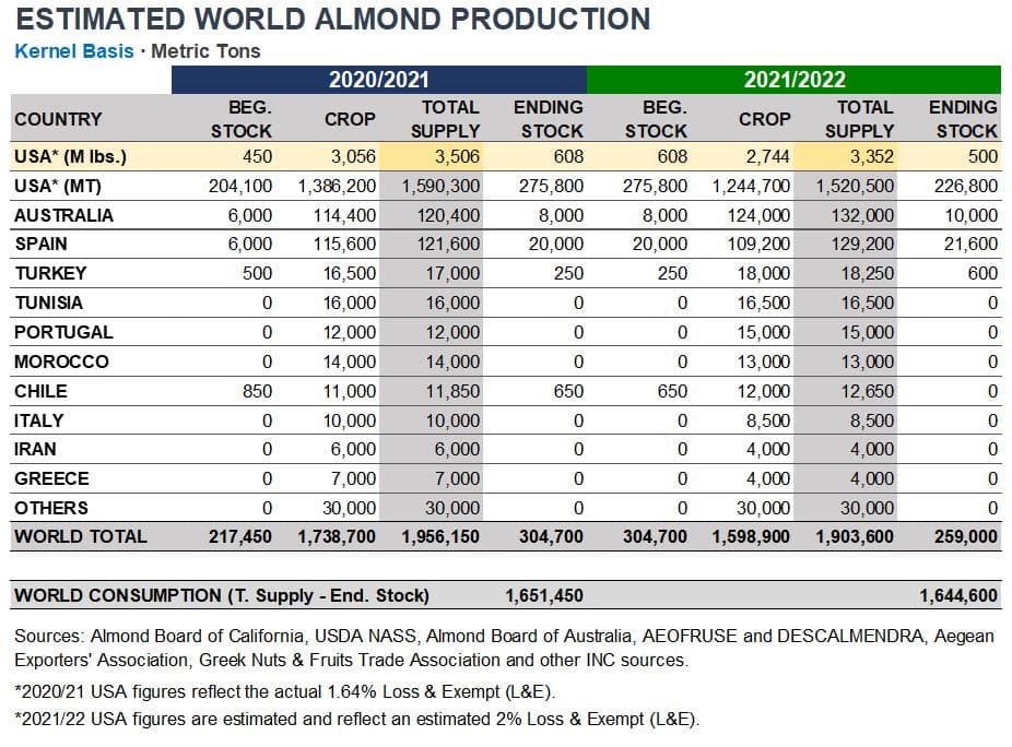 The August Almond Board of California Position Report –the first report of the 2021/22 crop year (August 2021-July 2022), published on September 10, 2021– shows receipts of 311.5 million lbs. (approx. 141,000 metric tons) of kernel weight through August 31, 2021. It is too early to determine if the estimated 2.8 billion lbs. crop (approx. 1.270 M MT) forecasted by the USDA National Ag Statistics Service will be realized. Often the August receipts number can be more indicative of harvest timing than overall crop size. More will be known about the actual receipts over the remaining months of harvest, hulling and shelling.